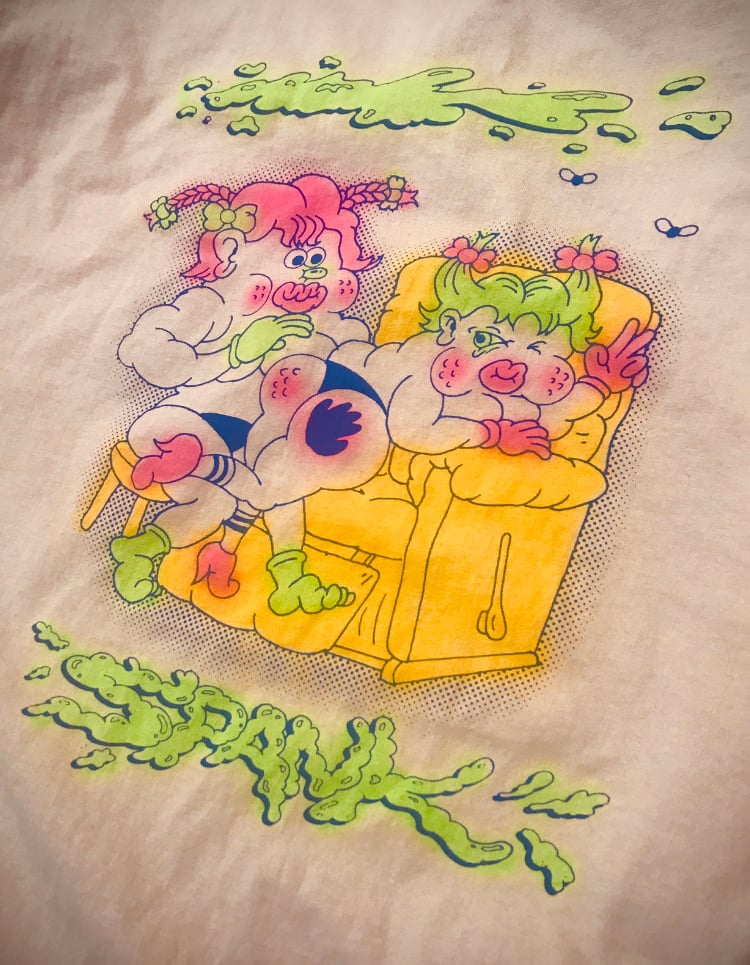 Screen Printed and air brushed. On beige. Not white.. the pic is old. but beige is better.